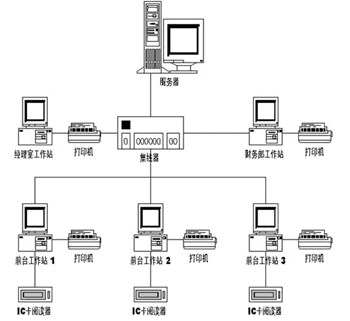 系統(tǒng)由IC卡閱讀器、工作站、服務(wù)器、打印機(jī)、相應(yīng)網(wǎng)絡(luò)及管理軟件組成。由工作站接收IC卡閱讀器的客戶數(shù)據(jù)并輸入消費(fèi)業(yè)務(wù)數(shù)據(jù),通過(guò)網(wǎng)絡(luò)保存到服務(wù)器。