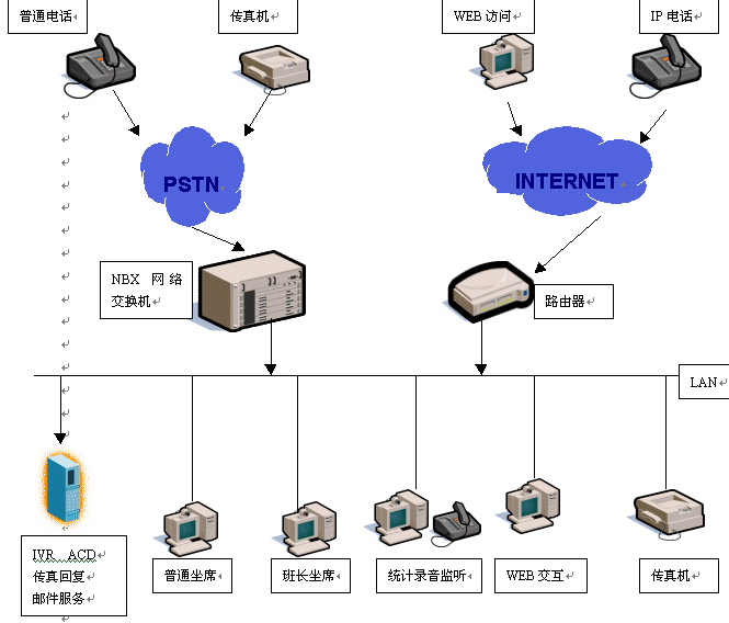 基于NBX 網(wǎng)絡(luò)交換機(jī)的呼叫中心對(duì)外部有PSTN和IP兩種接口,可以接入各種類型用戶:普通電話用戶、傳真用戶、WEB訪問用戶、IP電話用戶。NBX呼叫中心通過NBX網(wǎng)絡(luò)交換機(jī)將外部的PSTN信號(hào)轉(zhuǎn)換為以太網(wǎng)數(shù)據(jù)包信號(hào),在呼叫中心內(nèi)部通過局域網(wǎng)提供話音與數(shù)據(jù)服務(wù)的集成,從而即以開放的局域網(wǎng)包交換技術(shù)實(shí)現(xiàn)專用 PBX的話音服務(wù)功能并與現(xiàn)有局域網(wǎng)無縫集成,從而實(shí)現(xiàn)包括E-mail、傳真、聊天工具、視頻以及話音在內(nèi)的由多種通信媒介的交互。NBX呼叫中心通過統(tǒng)一的ACD將各種通訊方式的訪問協(xié)調(diào)分配,最終實(shí)現(xiàn)了呼叫的中心運(yùn)營和諧與高效。