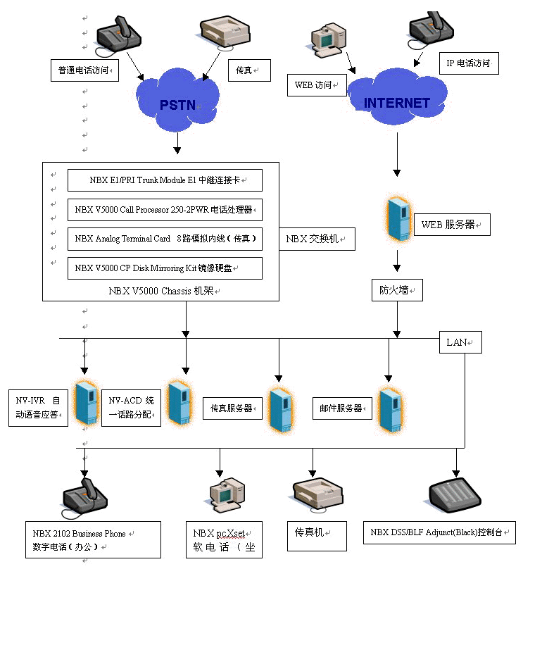 基于NBX的呼叫中心對(duì)外支持PSTN、IP兩種接入方式,可以實(shí)現(xiàn)各種接入:普通電話、傳真、IP電話、郵件、WEB訪問,NBX呼叫中心在技術(shù)上實(shí)現(xiàn)革命性的突破,在內(nèi)部實(shí)行語音數(shù)據(jù)兩網(wǎng)合一,將外部的模擬數(shù)據(jù)轉(zhuǎn)換為以太網(wǎng)數(shù)據(jù)包,由NV-ACD實(shí)現(xiàn)外部各種訪問的統(tǒng)一路由分配。