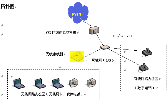 將無(wú)線網(wǎng)絡(luò)產(chǎn)品AirConnect和網(wǎng)絡(luò)電話交換機(jī)結(jié)合使用:可以將辦公的PC機(jī)或筆記本電腦安裝無(wú)線網(wǎng)卡,這樣在辦公室的任何位置移動(dòng)電腦,都不會(huì)妨礙局域網(wǎng)連接,然后在PC機(jī)或筆記本電腦中安裝NBX電話平臺(tái)的軟件電話,這樣工作人員就可以通過(guò)電腦的耳麥接聽(tīng)、撥打電話,而不需配置硬件電話。這樣,電話、電腦均可以移動(dòng)使用,不受線路的束縛。