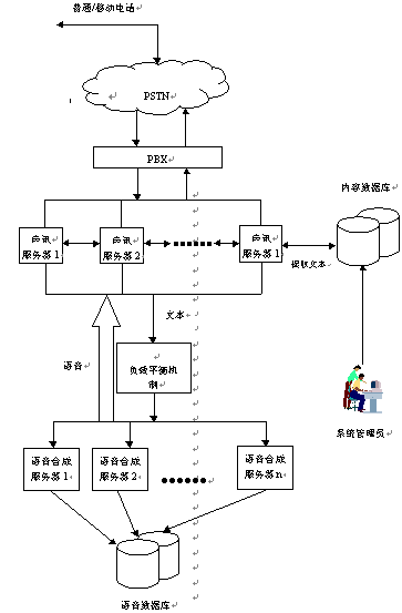當(dāng)用戶(hù)通過(guò)電話向聲訊服務(wù)器發(fā)出請(qǐng)求時(shí),聲訊服務(wù)器會(huì)首先作出分析判斷,然后從內(nèi)容數(shù)據(jù)庫(kù)中提取相應(yīng)的文本信息,經(jīng)過(guò)負(fù)載平衡機(jī)制發(fā)送給語(yǔ)音合成服務(wù)器。語(yǔ)音合成服務(wù)器在接收到文本后立刻開(kāi)始合成,同時(shí)將合成好的語(yǔ)音發(fā)送回語(yǔ)音服務(wù)器,再由語(yǔ)音服務(wù)器回傳給用戶(hù)。其中內(nèi)容數(shù)據(jù)庫(kù)中的信息可以由系統(tǒng)管理員定期進(jìn)行維護(hù)管理。(系統(tǒng)連接結(jié)構(gòu)見(jiàn)流程圖)