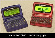“Talkabout T900”是摩托羅拉公司為微軟MSN專門設(shè)計生產(chǎn)的一種雙向?qū)ず魴C,它由一個緊湊型的小鍵盤和一個可以容納4行消息的屏幕組成,設(shè)計小巧,攜帶方便,可以方便用戶收發(fā)MSN提供的Hotmail免費郵件服務(wù)、接收短消息以及訪問MSN上的其它服務(wù),比如及時的股市行情、警示消息等等。