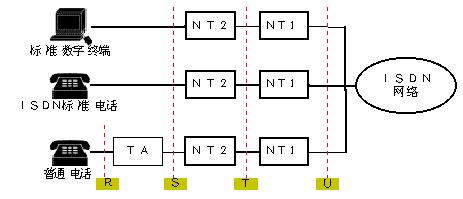 TA:終端適配器,完成非標準設備到ISDN速率的匹配及協(xié)議轉換(它可以在TE2中內嵌實現(xiàn));以上各類設備間的連接接口稱為參考點(見下圖):