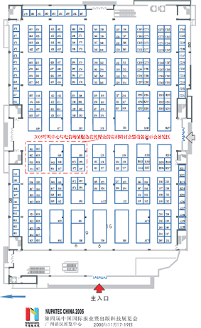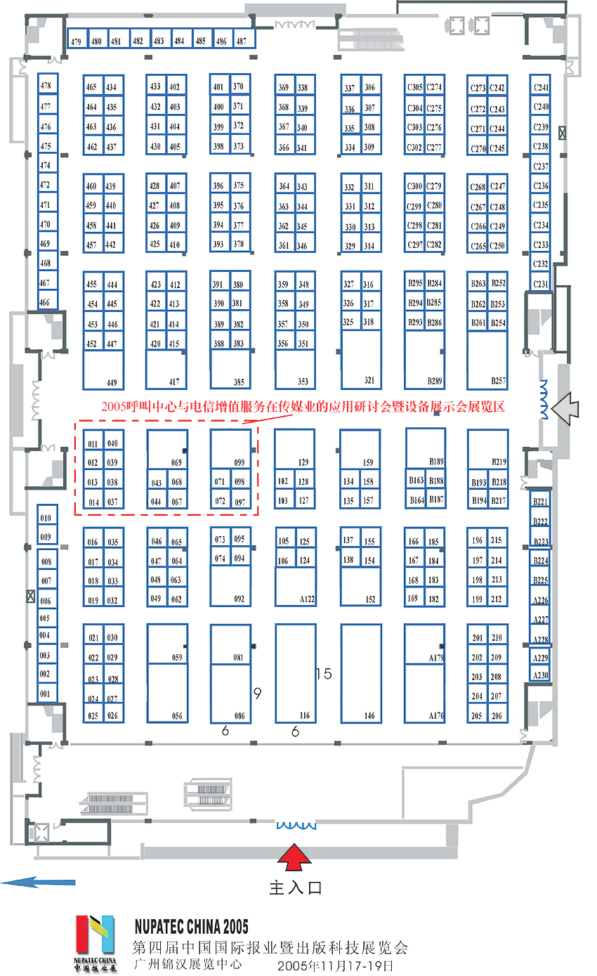 (圖中紅顏色邊框區(qū)為2005呼叫中心與電信增值服務(wù)在傳媒業(yè)的應(yīng)用研討會暨設(shè)備展示會展覽區(qū))