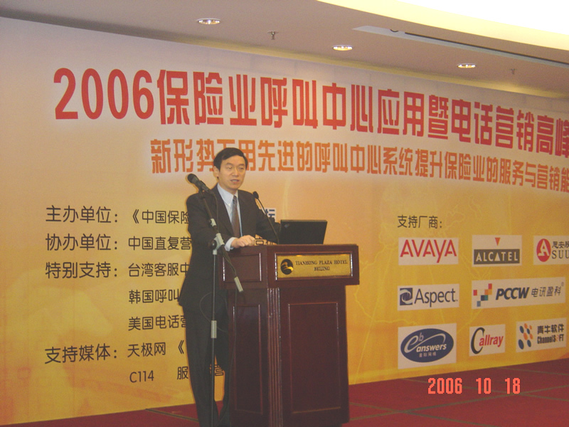 。。2006年10月18日,2006保險(xiǎn)業(yè)呼叫中心應(yīng)用暨電話營(yíng)銷高峰研討會(huì)在北京天鴻科園大酒店隆重召開,以下是大會(huì)開幕致辭的相關(guān)圖片報(bào)道: