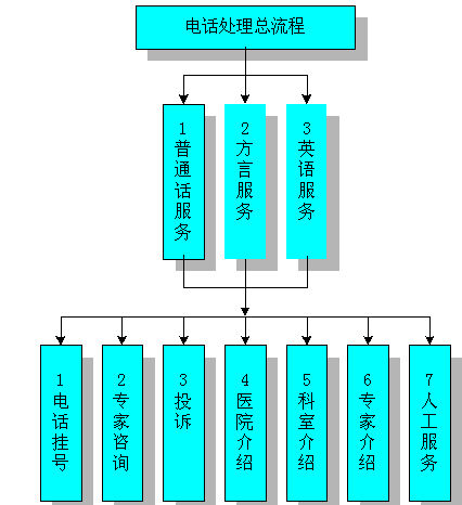 語(yǔ)種選擇完畢,系統(tǒng)提示用戶選擇服務(wù)類型:"請(qǐng)選擇服務(wù)種類:按1,電話掛號(hào);按2,專家咨詢;按3,投訴;按4,醫(yī)院介紹;按5,科室介紹;按6,專家介紹;按7,人工服務(wù)。"