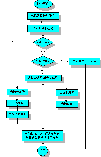 用戶連續(xù)三次輸入錯(cuò)誤,則服務(wù)終止。用戶輸入帳號(hào)密碼正確,則系統(tǒng)查詢用戶帳號(hào)上的資金,資金足夠,則系統(tǒng)繼續(xù)提示:"普通門診按1,專家門診按2"。