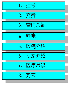 對(duì)于主流程里面的醫(yī)院介紹、科室介紹和專家介紹,只需要用戶按鍵選擇即可。而且對(duì)用戶不加限制,任何用戶(包括沒有就診卡的用戶)也可以查詢。