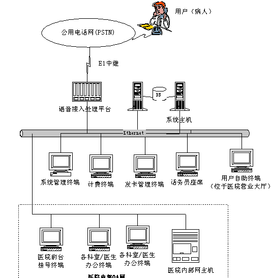 2.系統(tǒng)主機(jī) 系統(tǒng)主機(jī)一方面作為數(shù)據(jù)庫(kù)服務(wù)器,負(fù)責(zé)各種數(shù)據(jù),包括用戶信息、自費(fèi)卡信息、系統(tǒng)數(shù)據(jù)等的存儲(chǔ),同時(shí)作為應(yīng)用服務(wù)器控制各種業(yè)務(wù)流程的調(diào)用、處理,還包含TTF網(wǎng)關(guān),以完成傳真文件的生成和轉(zhuǎn)發(fā)功能、短消息處理、電子派單處理