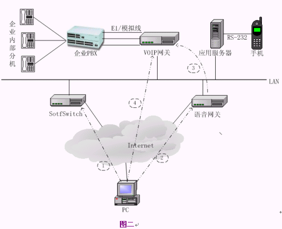 用戶使用系統(tǒng)時,需要先下載終端并安裝到PC上,然后在終端上撥企業(yè)內(nèi)部的分機(jī)號碼就可以了。對于一般的企業(yè),VoIP語音網(wǎng)關(guān)可以配置幾條模擬線到一個E1的規(guī)模,SoftSwitch、語音網(wǎng)關(guān)、應(yīng)用服務(wù)器可以安裝在一臺PC或PC服務(wù)器上,或者與企業(yè)的其它服務(wù)器(如代理服務(wù)器)合用,另外需要一到兩個公網(wǎng)IP地址資源。系統(tǒng)的硬件和網(wǎng)絡(luò)成本非常低,整個系統(tǒng)如果按一個E1(30路)容量計(jì)算,配置VoIP網(wǎng)關(guān)和一臺PC服務(wù)器,硬件價格不超過3萬元,如果VoIP網(wǎng)關(guān)支持隧道模式傳送信令和語音,則語音網(wǎng)關(guān)也可以省去。