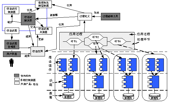 一體化信息平臺的總體結(jié)構(gòu)大體上分為數(shù)據(jù)層、功能、商業(yè)組件、處理環(huán)節(jié)、應(yīng)用過程層,功能層提供基本的基礎(chǔ)功能和商業(yè)功能元件,商業(yè)組件封裝了相關(guān)的數(shù)據(jù)和功能元件,可以被客戶關(guān)系管理系統(tǒng)各環(huán)節(jié)調(diào)用,通過以客戶為中心的信息流管理控制順序執(zhí)行處理環(huán)節(jié),實現(xiàn)商業(yè)過程。