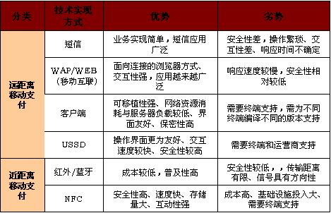移動支付(Mobile payment)包括遠(yuǎn)距離方式和近距離方式。遠(yuǎn)距離移動支付的主要技術(shù)實(shí)現(xiàn)方式有SMS、WAP、客戶端(手機(jī)軟件)和USSD;近距離移動支付的主要技術(shù)實(shí)現(xiàn)方式有紅外和NFC。各種移動支付業(yè)務(wù)技術(shù)實(shí)現(xiàn)方式優(yōu)劣勢比較詳見圖表1。