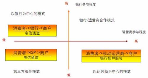 從產(chǎn)業(yè)鏈環(huán)節(jié)上看,移動支付的主要參與者主要包括:消費(fèi)者、平臺提供商、銀行、運(yùn)營商和商戶。其中,銀行和運(yùn)營商在其中具有較高的談判能力。因此,可以按照這兩者在產(chǎn)業(yè)鏈中的參與程度,劃分移動支付的商業(yè)模式?偟膩碚f,銀行機(jī)構(gòu)管理著廣大用戶的資金帳戶,擁有完善的支付體系,在支付領(lǐng)域具有天然的用戶信任。運(yùn)營商則擁有完備的網(wǎng)絡(luò)設(shè)施和先進(jìn)的IT系統(tǒng),通過定制終端,運(yùn)營商可以將各種先進(jìn)的移動應(yīng)用提供給用戶,使用戶獲得良好的移動化生活體驗(yàn)。因此,運(yùn)營商在這方面具有較好的用戶資源和營銷渠道。