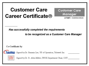 學(xué)員在經(jīng)過(guò)完整的課程培訓(xùn)之后,經(jīng)考試合格,可以獲得由美國(guó)俄亥俄州立大學(xué)與太維資訊有限公司聯(lián)合頒發(fā)的的專(zhuān)業(yè)培訓(xùn)證書(shū)?蛻(hù)服務(wù)中心認(rèn)證的目的有兩個(gè):首先,對(duì)于已經(jīng)在客服中心從業(yè)的人員,太維公司的培訓(xùn)可以提供一個(gè)提升他們工作能力的機(jī)會(huì),通過(guò)培訓(xùn)后不同層次的專(zhuān)業(yè)培訓(xùn)認(rèn)證,太維公司以行業(yè)的標(biāo)準(zhǔn)要求對(duì)他們的提升加以證明,以加強(qiáng)他們?cè)谛袠I(yè)中的競(jìng)爭(zhēng)能力。其次,對(duì)于有志致力于在客戶(hù)服務(wù)行業(yè)從業(yè)的人事,太維公司廣泛深入、滿(mǎn)足各種需求的專(zhuān)門(mén)技術(shù)培訓(xùn)與相應(yīng)的不同層次的認(rèn)證,為他們進(jìn)入該行業(yè)提供一個(gè)標(biāo)準(zhǔn)的素質(zhì)證明,以使他們能夠順利勝任客戶(hù)服務(wù)中心的各種主要的工作職位。