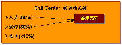 以上三項要素的相對比重,經(jīng)常被實施呼叫中心的企業(yè)所忽略。如果我們分析企業(yè)實施呼叫中心戰(zhàn)略難以成功的原因會發(fā)現(xiàn),問題并非出在技術層面上,而是它們對人員及流程的重視不足。