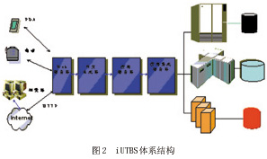 iUTBS的體系結(jié)構(gòu)與電子商務(wù)系統(tǒng)的體系結(jié)構(gòu)是一致的,服務(wù)器由4級(jí)結(jié)構(gòu)組成; Web服務(wù)器、動(dòng)態(tài)網(wǎng)頁(yè)生成器、應(yīng)用服務(wù)器、應(yīng)用集成服務(wù)器。如圖2所示。