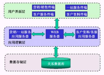 數(shù)據(jù)存儲(chǔ)層中以關(guān)系模型存儲(chǔ)了營(yíng)銷管理、一站服務(wù)、客戶檔案與客戶服務(wù)功能模塊所需的客戶、業(yè)務(wù)數(shù)據(jù);應(yīng)用邏輯層的WEB服務(wù)器向用戶界面層的瀏覽器提供WEB訪問(wèn)服務(wù),應(yīng)用服務(wù)器上的程序完成實(shí)際的業(yè)務(wù)邏輯,并將需向前臺(tái)返回的結(jié)果從數(shù)據(jù)庫(kù)中取出,交給WEB服務(wù)器;而前端的用戶界面層負(fù)責(zé)向用戶展現(xiàn)最終的處理結(jié)果。