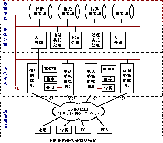 另一種方案是PDA和證券營業(yè)部前端機(jī)(實(shí)際就是電話委托前端機(jī))采用FSK通訊方式,使用電話委托的通道來完成所有的委托查詢。這種方式的速度快,信息容量大,保密性強(qiáng),而且營業(yè)部不需單獨(dú)申請電話線路,PDA和電話委托線路可動態(tài)分配,使其電話線路得到最大限度的利用。另外,營業(yè)部對外形象也好,只用一個號碼就可讓股民完成電話委托、PDA委托等多種委托方式,給股民帶來了方便。不過這種方式需要得到電話語音卡提供廠商的產(chǎn)品技術(shù)支持,語音卡必須同時支持標(biāo)準(zhǔn)的DTMF和FSK的方式,卡上有充足的能力來處理兩種方式,在語音處理卡的底層驅(qū)動應(yīng)該將電話和PDA的委托區(qū)別開來,目前市場能夠完全支持這種應(yīng)用的只有深圳市東進(jìn)通訊技術(shù)股份有限公司的產(chǎn)品,東進(jìn)技術(shù)的新一代PCI系列語音卡數(shù)字卡和模擬卡都完全采用DSP(數(shù)字信號處理器)架構(gòu),卡上有專用DSP來處理DTMF和FSK的收發(fā),是目前PDA委托前端的最好選擇;這種方案還應(yīng)該得到證券電話委托系統(tǒng)的開發(fā)商的支持,在電話委托系統(tǒng)里增加處理PDA委托的功能。目前恒基偉業(yè)的“股靈通”就是采用這種方式。