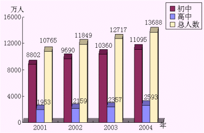 2001年,中國(guó)大陸中學(xué)學(xué)生人數(shù)已達(dá)10765萬人,而且學(xué)生人數(shù)還在快速增長(zhǎng)。初中學(xué)生人數(shù)以每年6.5%的速度增長(zhǎng),普通高中學(xué)生人數(shù)也以每年10%-11%的速度增長(zhǎng)?梢钥闯觯逃袌(chǎng)巨大的潛力和商機(jī)。