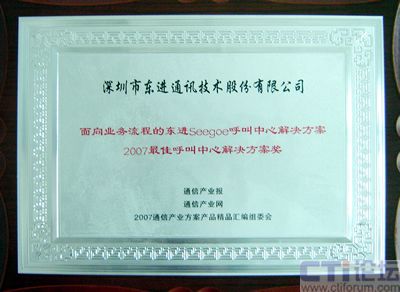 10月23日,中國國際通信設(shè)備技術(shù)展覽會國際通信展覽會開幕當(dāng)天,由通訊產(chǎn)業(yè)報(bào)社主辦的2007通信產(chǎn)業(yè)方案產(chǎn)品精品評選活動頒獎典禮隆重舉行,東進(jìn)技術(shù)的“面向業(yè)務(wù)流程的東進(jìn)Seegoe呼叫中心解決方案”榮獲2007最佳呼叫中心解決方案獎。