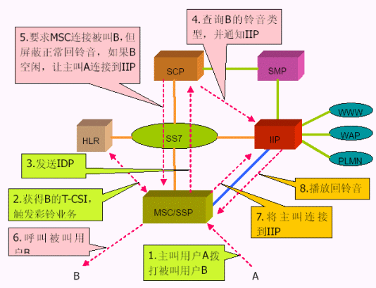 3. 智能網(wǎng)方式使用移動(dòng)智能網(wǎng)中的信令控制節(jié)點(diǎn)(SCP)實(shí)現(xiàn)智能業(yè)務(wù)的業(yè)務(wù)邏輯,新增的智能外設(shè)用于為用戶提供回鈴音和用戶管理功能。 個(gè)性化回鈴音業(yè)務(wù)是基于智能網(wǎng)系統(tǒng)的一個(gè)新業(yè)務(wù),在智能網(wǎng)中增加新的業(yè)務(wù)控制點(diǎn)(SCP)和獨(dú)立智能外設(shè)(IIP)。為此只需要為此業(yè)務(wù)加入基于Intel平臺(tái)的SCP和IP即可,前者是智能網(wǎng)體系中的業(yè)務(wù)控制設(shè)備,用于實(shí)現(xiàn)智能業(yè)務(wù)的業(yè)務(wù)邏輯,使用的是Intel高性能的c-PCI平臺(tái),支持高可靠性的冗余備份,提供業(yè)務(wù)呼叫控制和業(yè)務(wù)數(shù)據(jù)維護(hù)功能;后者是智能網(wǎng)獨(dú)立外設(shè),使用的是Inetl Dialogic的相關(guān)語音板卡,用于為個(gè)性化回鈴音用戶提供語音(回鈴音)、以及業(yè)務(wù)管理等功能。優(yōu)點(diǎn)是無須改動(dòng)現(xiàn)網(wǎng)上MSC/SSP 的軟件,通過采用SCP 查詢被叫用戶狀態(tài)的方式,只有當(dāng)被叫用戶處于空閑的情況下,才使用IIP 進(jìn)行處理,可以減少系統(tǒng)負(fù)荷,降低SSP 與IIP 之間話路的占用。缺點(diǎn)是需要MSC支持智能網(wǎng)業(yè)務(wù)。