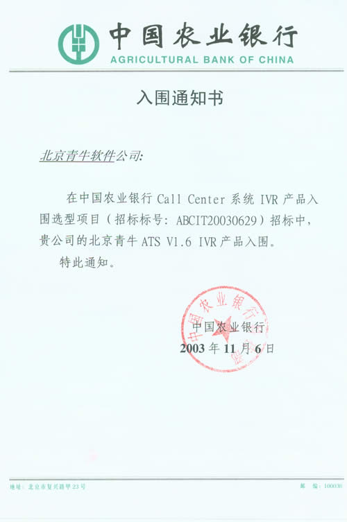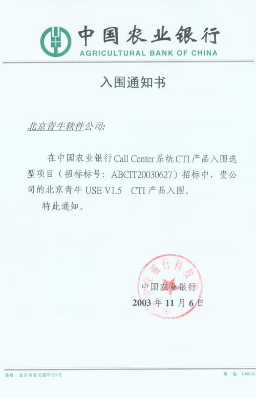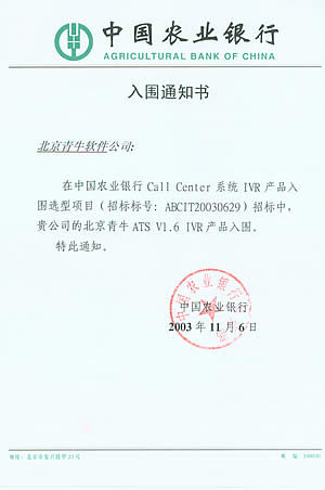 北京青牛軟件技術(shù)有限責(zé)任公司憑借多年來深厚的技術(shù)基礎(chǔ)、完善的咨詢服務(wù)和優(yōu)異的產(chǎn)品表現(xiàn),在本次CTI產(chǎn)品、IVR產(chǎn)品入圍選型項(xiàng)目中脫穎而出。青牛軟件此次入圍中國農(nóng)業(yè)銀行總行Call
