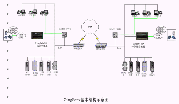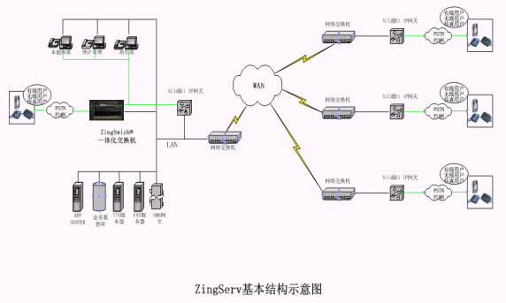 硬件:各點都有ZingSwitch®,S口網(wǎng)關(guān)和CO8卡或E1 接口網(wǎng)關(guān)和E1卡。