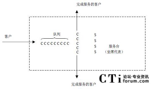 呼叫中心是一個(gè)典型的排隊(duì)系統(tǒng)。電話一個(gè)接著一個(gè)到來,接受各種服務(wù)。如果一個(gè)到達(dá)的客戶不能立即接受服務(wù),這個(gè)客戶就加入到一個(gè)隊(duì)列中進(jìn)行等待,圖示是一個(gè)單隊(duì)列的排隊(duì)模型,如果呼叫中心擁有多個(gè)隊(duì)列,則需要構(gòu)造多個(gè)上述的排隊(duì)模型。