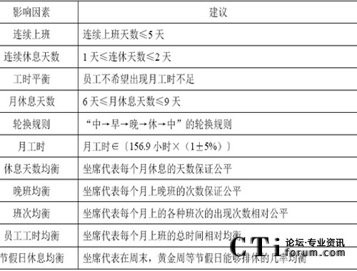 要滿足每半小時(shí)實(shí)際安排的座席數(shù)量不少于需要的座席數(shù)量的要求,首先就需要進(jìn)行班次的設(shè)計(jì),這是為第五環(huán)節(jié)資源規(guī)劃而準(zhǔn)備的!鞍啻卧O(shè)計(jì)”是指設(shè)計(jì)出一系列的班次,比如早班,中班,晚班,等等。而將來只要告訴員工,你下個(gè)月每天各上什么樣的班次即可。在班次設(shè)計(jì)時(shí),需要充分考慮前面提到的一些影響因素:如下所示。