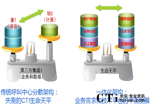 因此很長(zhǎng)一段時(shí)間以來(lái)呼叫中心都作為語(yǔ)音通訊的分支之一而存在,而這種定位給呼叫中心的生命力帶來(lái)了不平衡的發(fā)展,根源就在于“輕C重T第三方集成I”的格局:語(yǔ)音處理性能和功能強(qiáng)大,計(jì)算能力和數(shù)據(jù)處理弱,因此將業(yè)務(wù)集成和數(shù)據(jù)集成交由第三方承擔(dān)。因此很長(zhǎng)一段時(shí)間,造成呼叫中心在企業(yè)購(gòu)買之后對(duì)業(yè)務(wù)應(yīng)用的適應(yīng)能力差、業(yè)務(wù)發(fā)展和變化時(shí)系統(tǒng)穩(wěn)定性變的無(wú)法保證。