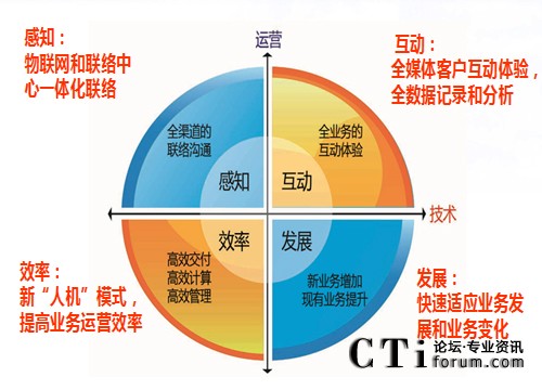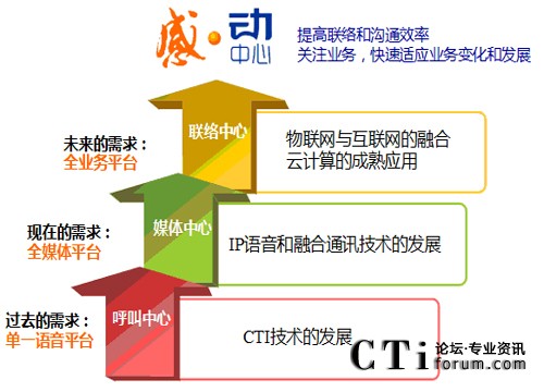 這是“感•動(dòng)中心”的主旨,完全以客戶的業(yè)務(wù)為出發(fā)點(diǎn),體現(xiàn)“以客戶為中心”的理念。而“全景中心”、“聯(lián)絡(luò)中心”等以純技術(shù)為中心,還停留在多媒體通訊和UC通訊手段融合層面,只是新增加了一些新方式的接入等技術(shù),對(duì)于客戶業(yè)務(wù)的融合和適應(yīng),并沒有任何提升。