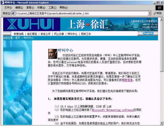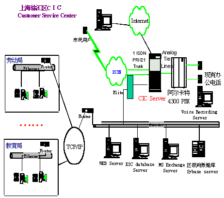 上海市徐匯區(qū)市民咨詢(呼叫)中心的第一期工程包括語音自動應(yīng)答IVR、按需傳真Fax on Demand、語音郵件Voice Mail、網(wǎng)頁互動Web Interaction、座席屏幕彈出Agent Screen Pop、報(bào)表以及語音記錄等功能。該中心具有以下特點(diǎn),很好地滿足了徐匯區(qū)政府的要求。