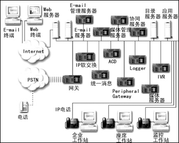 從上面的圖1、圖2中,可以看到IP通信大大簡化了企業(yè)的網(wǎng)絡(luò)通信結(jié)構(gòu)。但是為了實(shí)現(xiàn)不同的功能和應(yīng)用,網(wǎng)絡(luò)中仍然存在很多的服務(wù)器,各個品牌不同功能的服務(wù)器之間的協(xié)同成為最顯著的問題,同時維護(hù)和運(yùn)行這樣大量的設(shè)備也需要大量的資源支持。而且,這僅是單點(diǎn)的客戶服務(wù)中心所需的配備,而在基于IP通信的分布式客戶服務(wù)中心的構(gòu)建中,所涉及的設(shè)備更多。
