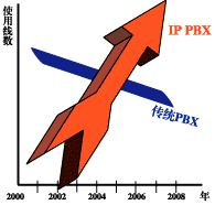 "2005年IP-PBX的使用線數將超過傳統(tǒng)PBX。從2001年開始傳統(tǒng)PBX以每年12%的速度在下降,IP-PBX以每年30%的速度增長"。