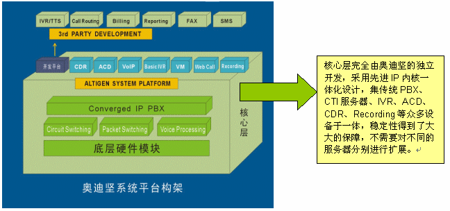 值得一提的是,在穩(wěn)定性上,奧迪堅IP一體化呼叫中心平臺系統(tǒng)構(gòu)架,從產(chǎn)品設(shè)計之初就突破了以住基于交換機或板卡的傳統(tǒng)模式,在一臺通訊服務(wù)器上高度融合了呼叫中心的所有常用功能,有效避免了復(fù)雜的網(wǎng)絡(luò)連接和眾多的各類交換機和外掛設(shè)備,各個設(shè)備相對獨立兼容性差所給呼叫中心系統(tǒng)所帶的穩(wěn)定性欠佳的隱患。除此之外,奧迪堅呼叫中心系統(tǒng)底層硬件模塊是在美國設(shè)計生產(chǎn)的,通過北美和中國的嚴格的電信入網(wǎng)測試;相對于硬件,平臺軟件也都是由奧迪堅自主開發(fā)設(shè)計的,針對不同的硬件采用不同的驅(qū)動模塊,軟硬一體在交換層又使用統(tǒng)一的邏輯接口,結(jié)構(gòu)清晰,層次合理,不僅保障了穩(wěn)定而且便于擴展(如下圖所示),整個系統(tǒng)作為一個整體統(tǒng)一擴展,不需要對不同的服務(wù)器分別進行擴展,有效避免了傳統(tǒng)呼叫中心構(gòu)建方式在擴展方面存在的復(fù)雜性問題以及高額的擴展費用。