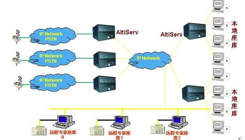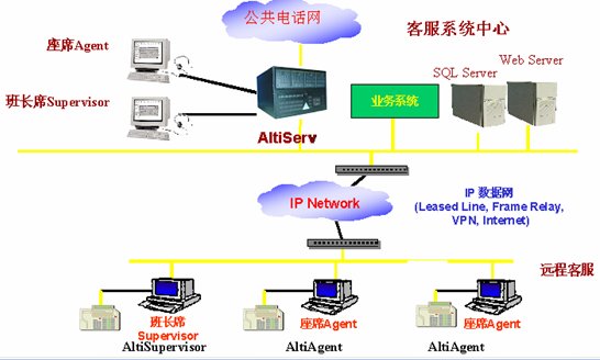 這種組合節(jié)省管理成本,因為所有的座席員都在一點,便于管理控制,同時用戶只要撥打本地電話即可進入系統(tǒng)接收服務,如需人工座席應答的話系統(tǒng)會自動將來電通過Internet轉接到座席員處,對公司的話費成本也較低(都是通過Internet實現(xiàn)的長途轉接功能)。同時AltiGen也支持通過IP分機的方式遠程登錄到系統(tǒng)實現(xiàn)遠程座席的功能,這樣對有些高級話務員或專家座席,不必每天到公司上班,可以通過家里的電腦登錄到AltiGen系統(tǒng),作為系統(tǒng)的一個分機來完成所有的座席員的功能,在他的電腦屏幕上也能彈出來電人的信息。系統(tǒng)的組網圖如下: