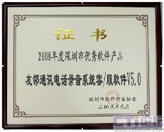 2009年1月,友鄰?fù)ㄓ嶋娫掍浺粝到y(tǒng)客/服軟件V5.0 榮獲由深圳市軟件行業(yè)協(xié)會(huì)頒發(fā)的“2008年度深圳市優(yōu)秀軟件產(chǎn)品”榮譽(yù)證書!2008年度深圳市優(yōu)秀軟件產(chǎn)品”的評(píng)選是深圳市軟件行業(yè)協(xié)會(huì)在全市范圍內(nèi)舉辦的軟件產(chǎn)品推優(yōu)活動(dòng),經(jīng)過(guò)了企業(yè)申報(bào)、技術(shù)資料審核、專家評(píng)審等等幾大嚴(yán)格篩選程序。