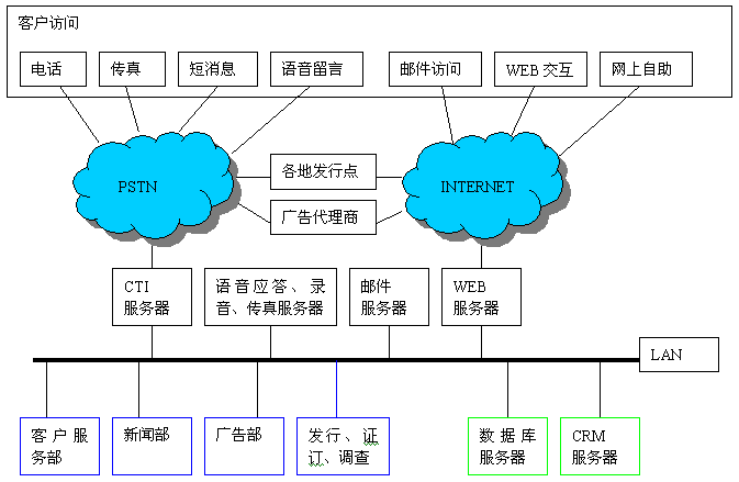 硬件方面,采用價格經(jīng)濟、功能靈活的基于語音板卡的呼叫中心平臺。在軟件方面,采用高可靠性的實時LINUX操作系統(tǒng)。具有高效、穩(wěn)定、安全以及功能齊全等特點。坐席端軟件實現(xiàn)了強大電話處理功能,支持實時錄音、兼聽、強插、強拆等應(yīng)用;跒g覽器的瘦客戶端與CRM的客戶界面完美融合。并且提供詳盡的報表功能。支持智能化路由、多種排隊策略的選擇,實現(xiàn)與CRM無縫結(jié)合。