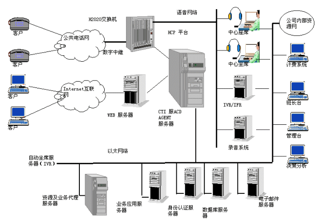 該方案完全以服務(wù)為核心,是基于軟件的呼叫中心解決方案,它采用網(wǎng)絡(luò)分布式多層對象體系,采取全媒體的接入方式,整合了從尋呼、電話、傳真、短信息到電子郵件、WEB/IP與各種資源,從而形成一個(gè)統(tǒng)一的服務(wù)平臺。
