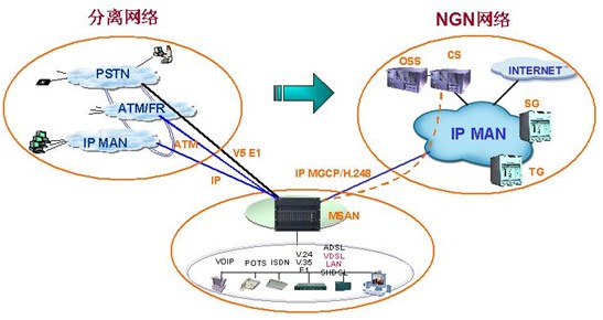 隨著運營商光進銅退大潮的推進,融合了寬帶和傳統(tǒng)窄帶接入、同時支持PSTN和NGN的MSAN綜合接入設(shè)備成為運營商網(wǎng)絡(luò)建設(shè)的新熱點。MSAN的應(yīng)用可以降低運維成本,提升業(yè)務(wù)投放的靈活度,有助于運營商從傳統(tǒng)固網(wǎng)運營商向多業(yè)務(wù)運營商的角色轉(zhuǎn)變。MSAN的引入不但可以充分兼容現(xiàn)有的PSTN、ATM以及IP網(wǎng)絡(luò)、提供TDM語音、窄帶數(shù)據(jù)業(yè)務(wù)、寬帶業(yè)務(wù)和視頻業(yè)務(wù)的綜合接入,還可以適用于未來的NGN,提供VoIP業(yè)務(wù)。