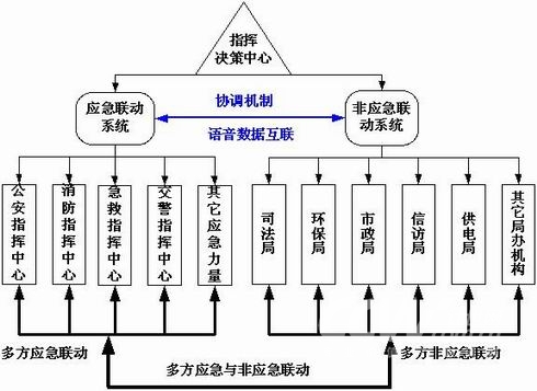 所謂“應(yīng)急與非應(yīng)急一體化聯(lián)動”,就是在應(yīng)急聯(lián)動和非應(yīng)急聯(lián)動的基礎(chǔ)上,通過先進的技術(shù)手段實現(xiàn)應(yīng)急聯(lián)動系統(tǒng)與非應(yīng)急聯(lián)動系統(tǒng)的高度整合,無縫聯(lián)接,并通過相應(yīng)的協(xié)調(diào)機制,實現(xiàn)各種應(yīng)急處置力量和非應(yīng)急處理部門的一體化的協(xié)同與聯(lián)動,以共同應(yīng)對和協(xié)調(diào)解決各種尤其是涉及多個方面的緊急或非緊急的事件和問題。