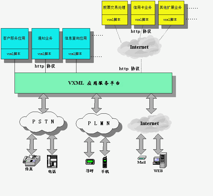 2000年3月由AT&T,Lucent,Motorola,IBM四家公司發(fā)起并提出的VoiceXML標(biāo)準(zhǔn)語(yǔ)言為語(yǔ)音增值業(yè)務(wù)的發(fā)展帶來(lái)了新的生機(jī)和變化。由于VoiceXML是XML語(yǔ)言的分支和子集,因此天然可以與因特網(wǎng)無(wú)縫連接。這使得傳統(tǒng)的語(yǔ)音業(yè)務(wù)可以無(wú)限擴(kuò)展到龐大的互聯(lián)網(wǎng)體系中,可以真正“讓我們用聲音傾聽(tīng)互聯(lián)網(wǎng)”。