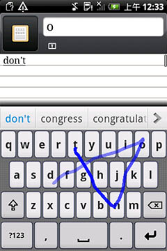 如圖所示,Nuance T9 Trace英文輸入方案對于各種不同的字母組合都能有效識別,像“google”這種既有連續(xù)又有間斷重復(fù)字母的單詞也不在話下,一次就能精準(zhǔn)輸出。另外,該輸入法還可以省去標(biāo)點符號,如“don"t”“can"t”等單詞,用戶只需滑觸“d-o-n-t”這四個字母,輸入法就會自動識別。