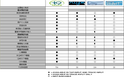 圖:Nuance T9 Trace與同類型輸入法功能對比表