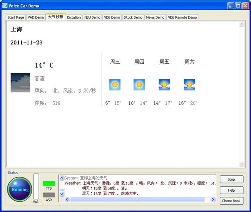 比方說這個關(guān)于空調(diào)問題,我們過去,空調(diào)的命令詞是“把空調(diào)打開,空調(diào)溫度提高3度!爆F(xiàn)在我也可以這樣說,空調(diào)調(diào)高一點,我有點冷,也可以。就是你在車?yán)镞呁耆梢杂媚阕约旱恼Z言來說你想干的事。比如說,前邊你不知道明天天氣會怎么樣,人一般都會想想,明天天氣如何,或者是告訴我天氣預(yù)報。但是你也可以這樣說。明天會下雨嗎?也可以這樣說;蛘吣氵@樣說,你說,今天大盤怎么樣。完全是用自然語言來說。堵不堵車,“查詢交通情況!边@就是,實際上可以有各種不同的說法來完成這個任務(wù),這是我們自然語言的一個演示。