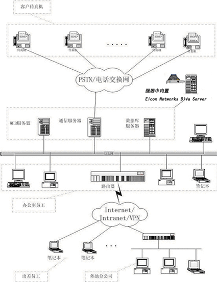 本系統(tǒng)采用最新的J2EE WEB技術(shù),在組成結(jié)構(gòu)上主要由以下三大模塊組成:1)WEB服務(wù)器: 完成用戶通過(guò)IE瀏覽器接入訪問(wèn), 傳真發(fā)送及接收的操作界面,傳真結(jié)果的查詢,客戶地址本的維護(hù)等工作;2)傳真發(fā)送/接收通信服務(wù)器:主要完成驅(qū)動(dòng)傳真板卡,通過(guò)通信線路收發(fā)傳真,檢測(cè)通信線路、對(duì)方狀態(tài),發(fā)送接收隊(duì)列管理等工作;3)數(shù)據(jù)庫(kù)服務(wù)器:主要負(fù)責(zé)用戶信息,用戶地址本信息,傳真記錄等信息存儲(chǔ)工作。