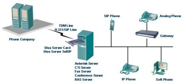 Asterisk IP PBX與Diva Server結(jié)合就能夠?qū)崿F(xiàn)IP PBX與呼叫中心完美結(jié)合的一體化解決方案,該方案結(jié)合了IP網(wǎng)的靈活性及Eicon