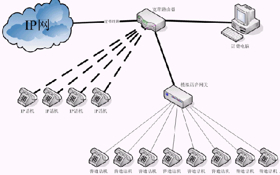 1、 最典型的IP話吧的聯(lián)接方式是寬帶線路連接寬帶路由器,計(jì)費(fèi)電腦和模擬語音網(wǎng)關(guān)連接寬帶路由器,普通話機(jī)連接模擬語音網(wǎng)關(guān),通過計(jì)費(fèi)電腦可以控制模擬語音網(wǎng)關(guān)上的各個話路,其操作包括開機(jī)、停機(jī)、計(jì)費(fèi)和統(tǒng)計(jì)話費(fèi)等。