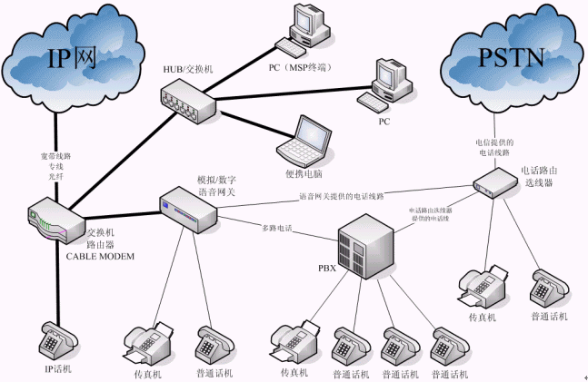 2、 數(shù)據(jù)線路連接語音網(wǎng)關(guān),語音網(wǎng)關(guān)和原電信提供的電話線路接入電話路由選線器,電話路由選線器再連接普通話機(jī)、傳真機(jī)或用戶端的PBX。