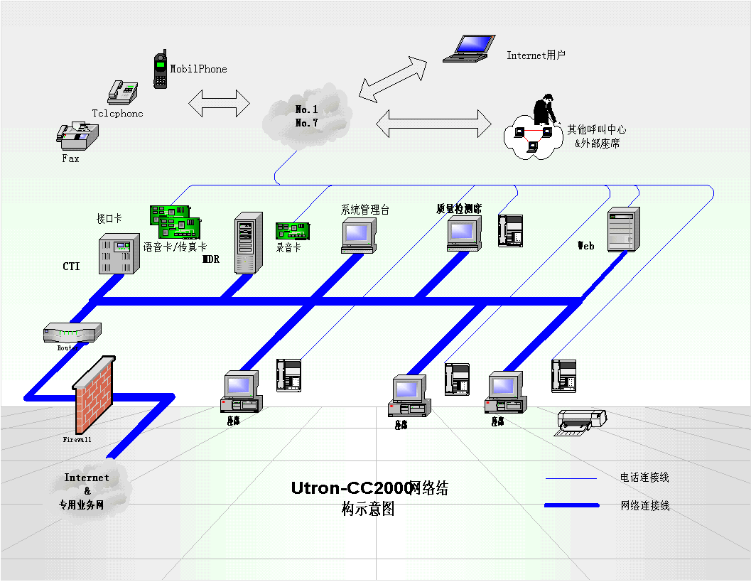 。。Utron-CC2000電信客戶服務(wù)中心系統(tǒng),支持傳統(tǒng)電話、傳真、電子郵件、Web等多種媒體呼叫接入,提供多種特服業(yè)務(wù)(112、114、170、180、189等)的綜合受理,從而實現(xiàn)電信客戶服務(wù)中心的基本建設(shè)目標: